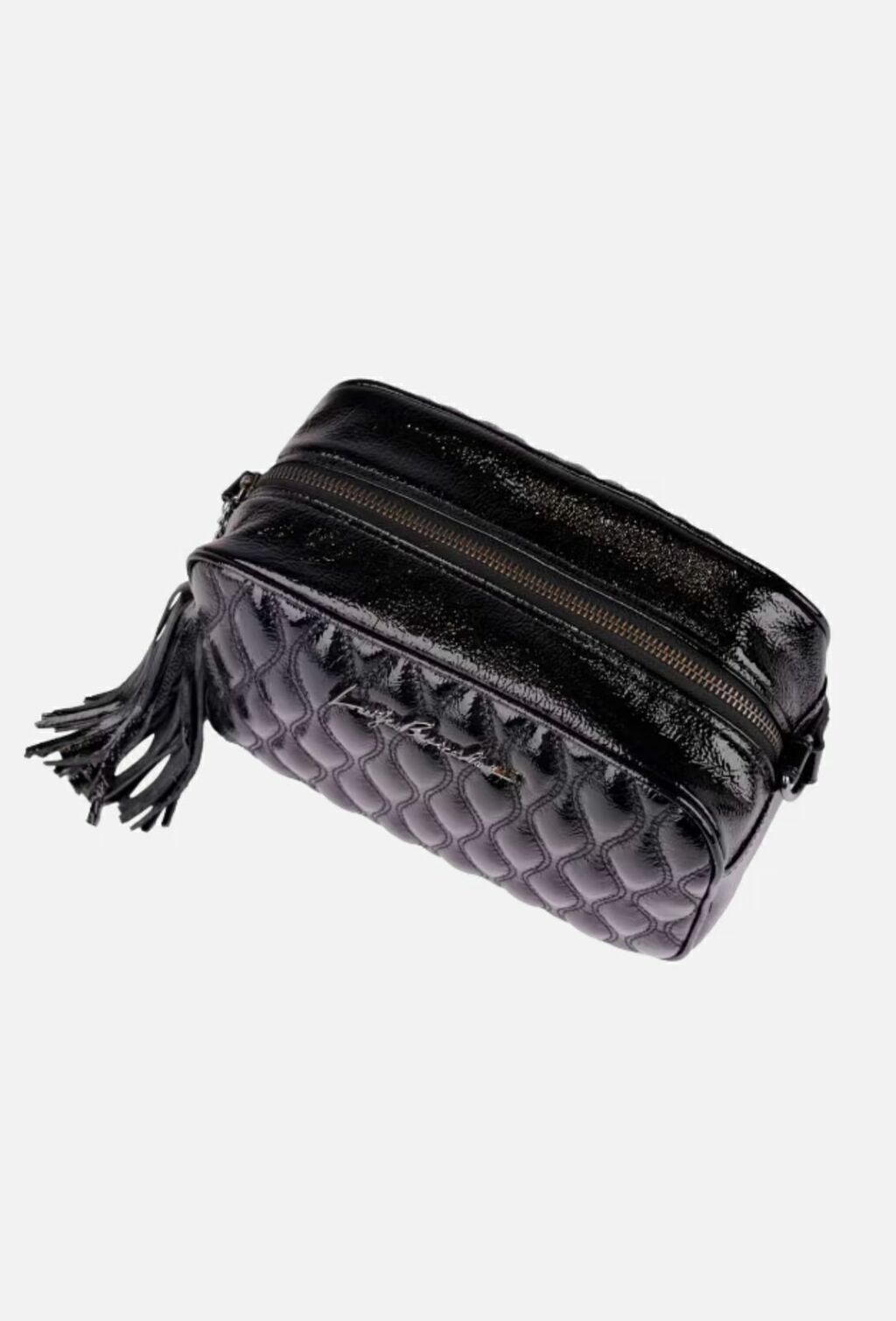 A mulher contemporânea precisa de um closet tão versátil quanto o seu dia a dia. Aposte em acessórios clássicos como esta bolsa Luiza Barcelos. O modelo é produzido em couro com acabamento envernizado no tom azul marinho com superfície em matelassê, possui formato retangular, compartimento interno, nome da marca metalizado aplicado na parte frontal, alça longa ajustável e fechamento superior por zíper com barbicacho